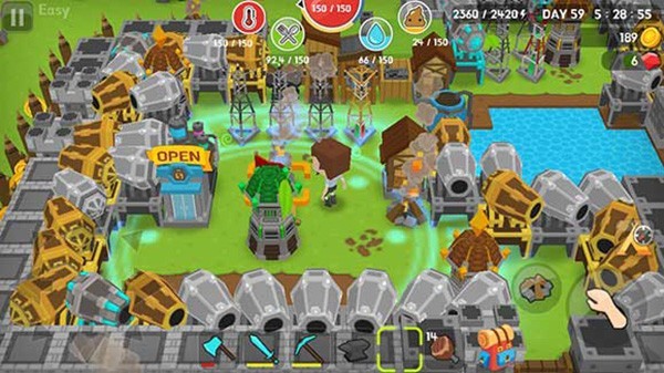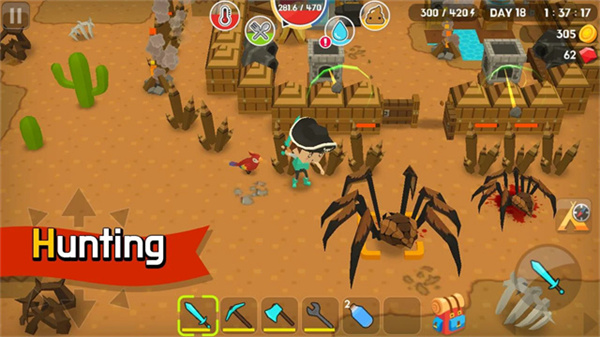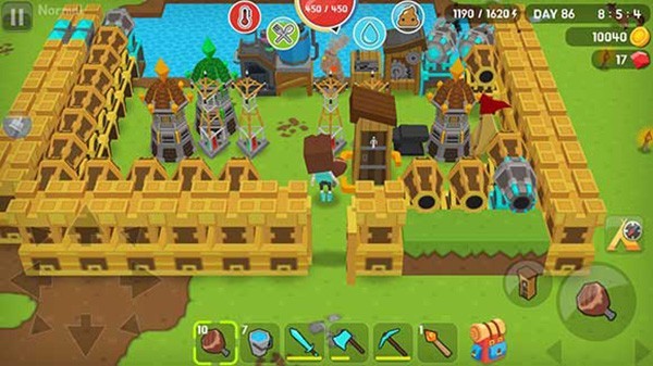 房子差不多建起来以后,每天要干的事就都差不多了。早上出门先把晚上掉的钱和资源收了。每天都去各种采矿,隔两三天就去打猎打水。打猎盯着鸡和兔子就够了,石剑砍三四下就死了。攒了一定数量的树苗就找个地方种下,回头一口气收光的时候很爽。天黑之前一定要回家。回家先放陷阱,修补墙,然后就回去关好门,烤肉净水上厕所做东西。如果墙被打破拆迁队杀进来,记得找地方躲好保护好自己。不要站在门边,会掉血。