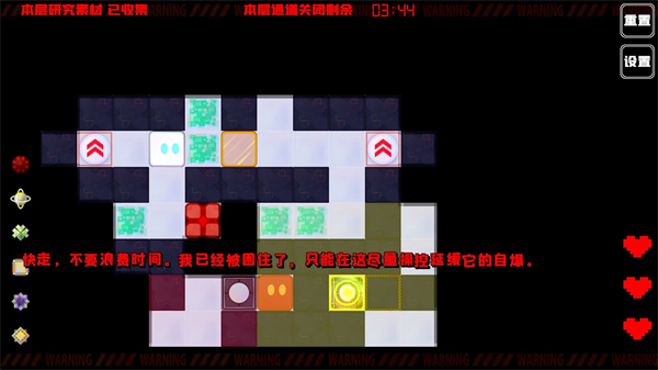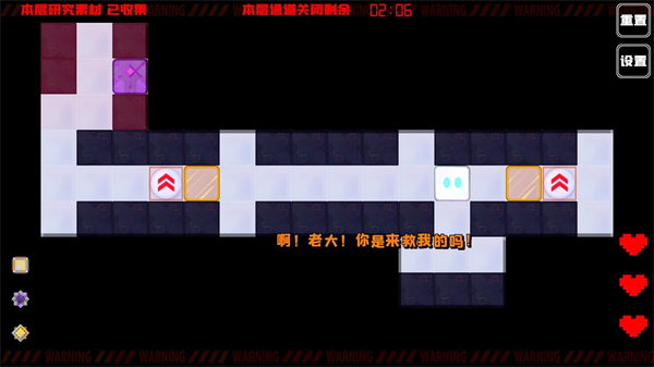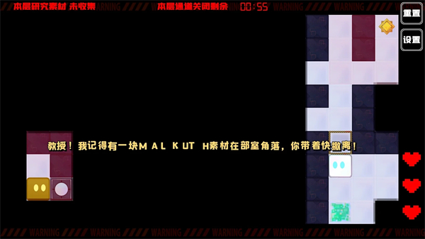 无暇拯救是一款非常有趣的休闲益智游戏,在这款游戏中你将和你的导师被困在一个黑暗不知路径的方格地图中,你需要根据导师的指引来寻找那些丢失的素材方块,将它们带离这个黑暗的迷宫,在游戏中绿色的化学实验区经过时会扣除一点生命。
