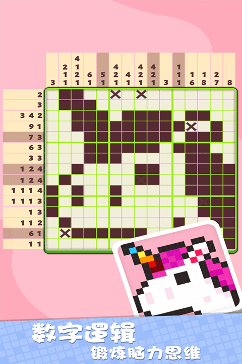 根据行列数字线索填充格子,最终还原出一幅完整的像素画。