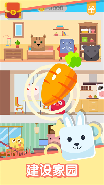 4.解锁了第一个房间的家具后,小动物们也住了进来。之后可以拖动下方的食物到小动物身上后需要停留一会给它们喂食,吃完后会给金币,增加亲密度。
