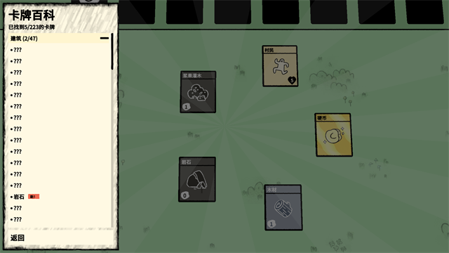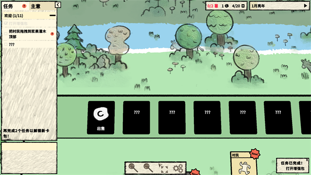 4、一共获得了木材、浆果灌木、村民、岩石以及硬币五张新卡牌,按照左侧的任务要求,移动这些卡牌。