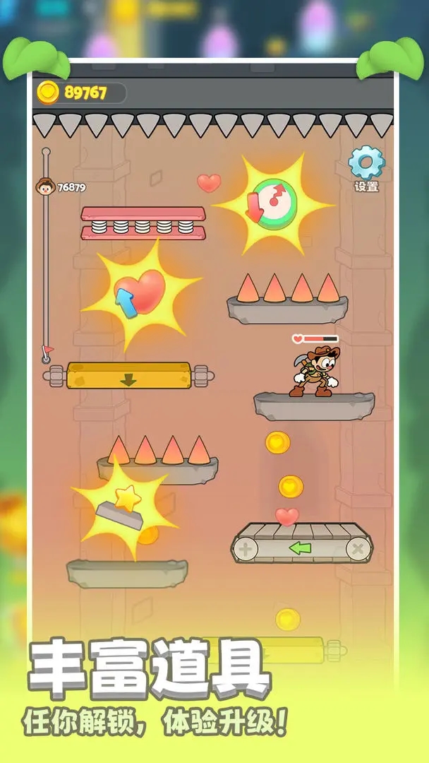 在贪婪古堡手游中,拥有非常多不同类型的平台,有弹跳平台、普通平台以及陷阱平台等等,你的角色有生命值数值,当你踩到陷阱平台时会扣除一定的血量,当然有些平台上还会出现一些特殊的道具,这些道具能够提供更多帮助。
