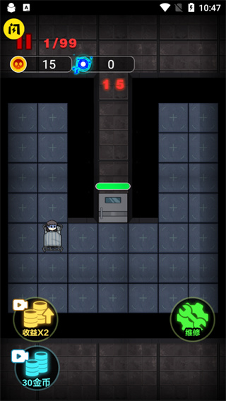 2、关门上床发育,建造武器,升级床和门,噬梦者攻击门的时候可以点击右下角的维修;