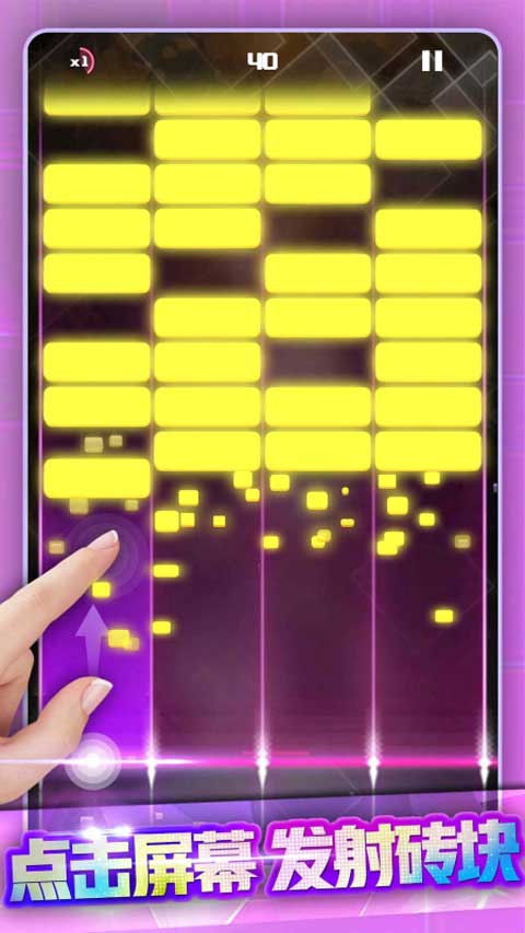 3、点击屏幕,将一行中出现空缺的地方补充砖块,当砖块补充完整之后就会自动消除,当消除一行砖块就会获得分数。