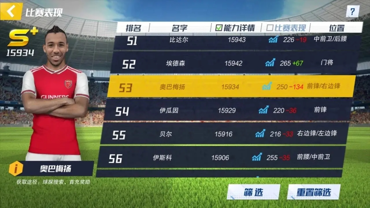 战力排名第二的是奥巴梅杨,战力15934。场上位置前锋和右边锋,对阵型设置没有局限性,球员技能和球员位置契合度较低。