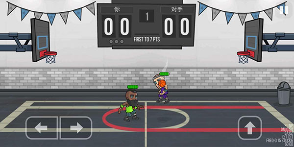 2、我们按住屏幕左下角的两个箭头可以控制角色移动,用手指按住屏幕右侧空白区域可以控制角色跳投,不过跳投的时候的注意一点,在主角跳到空中的时候就得放开手指,否者我们的角色是不会将篮球投出去的。