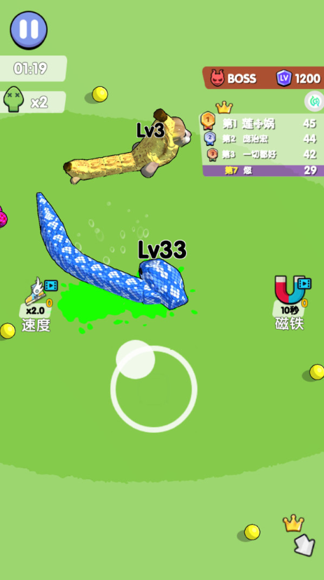 3、观察其他玩家的移动轨迹,运用加速技能巧妙绕到对手前方,用身体阻挡其前进路线,诱导对方撞上你的蛇身。