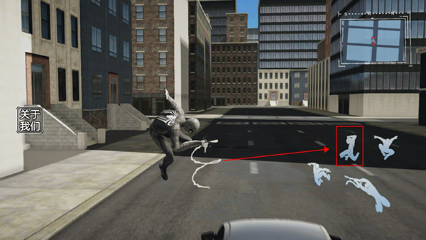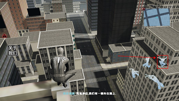 4、玩家在跟紧车辆后可以点击蛛丝发射按钮,发射蛛丝,控制蜘蛛侠跳跃到车上。