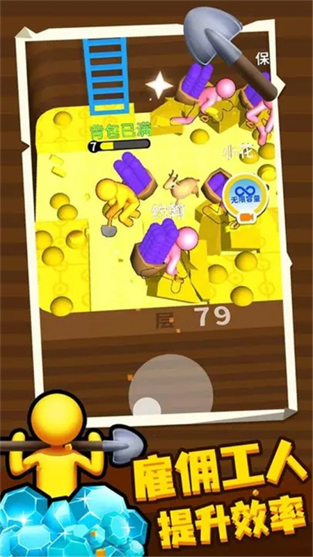 挖土达人是一款休闲卡通风格的RPG挖土游戏,开局一把铲,家园全靠挖,挖出你的致富人生!通过挖土来获取矿石,越深层的矿石越贵,将你的矿石背到兑换点处进行兑换金币,然后用金币就可以购买更多的家园设施,从买地到装修房屋,实现你的致富之路。