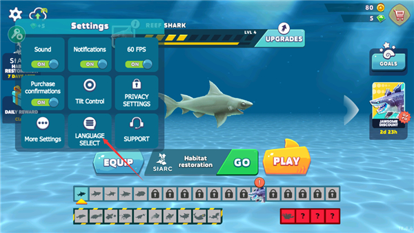 在游戏中玩家可以使用金币对鲨鱼的速度、血量、撕咬的范围进行升级,升级后可以使得鲨鱼的捕杀能力有了很大的提高。玩家在进行游戏的时候能升级就尽量的升级吧。