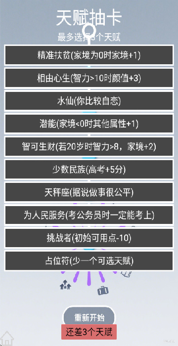 4、一次人生体验可能不完美,多次重启游戏尝试不同的选择,会发现更多有趣的内容和结局。