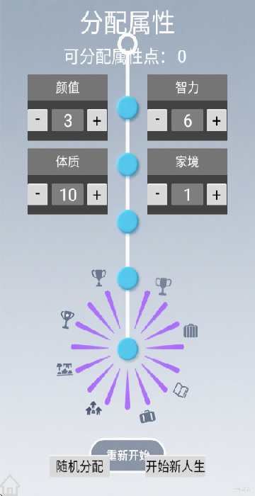 3、进入分配属性时,你可以根据需求对颜值、智力、体质、家境做分配。
