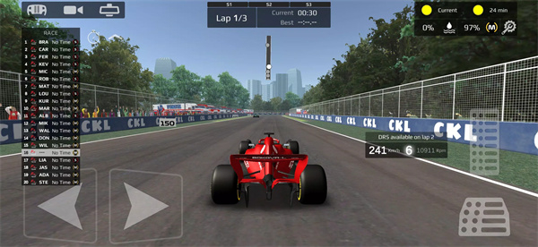 3.在比赛中,通过点击屏幕左侧可以控制赛车的转向,而屏幕右侧的按钮则用于加速和减速。