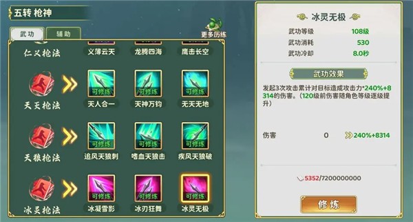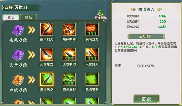 二转:视情况补充狂风万破(增加怒气时间)、霸气破甲(加追伤)、气沉丹田(增加武功防御和生命值)、真武绝击(提高会心率);