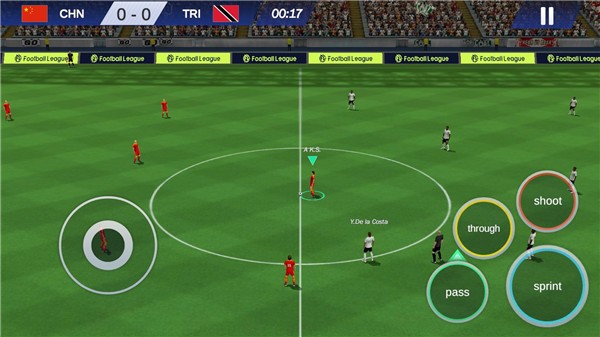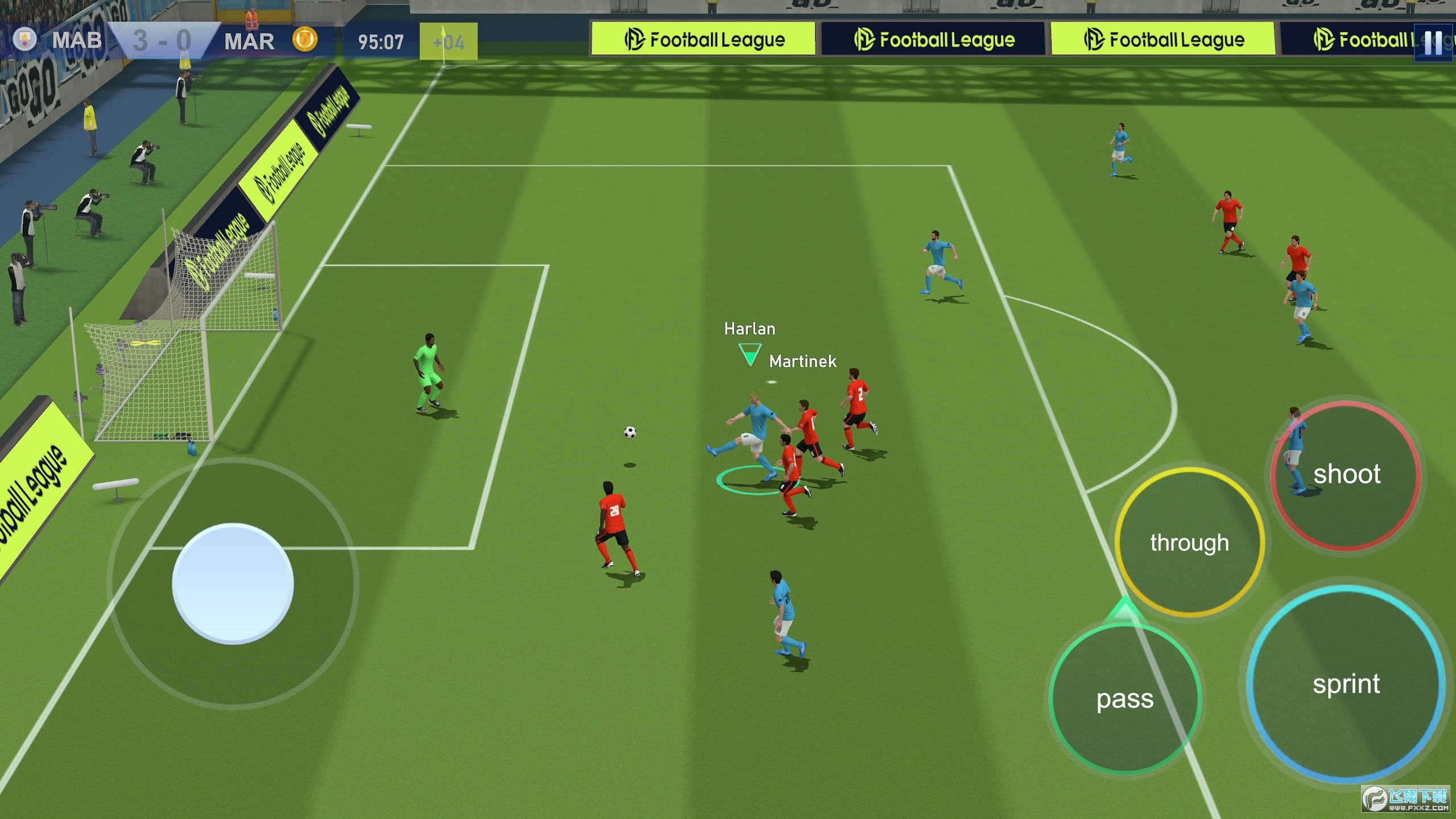 1、开始比赛后,左边为控制移动,右边最大的图标【sprint】是加速奔跑,【pass】传球,【through】射门,【shoot】铲球。