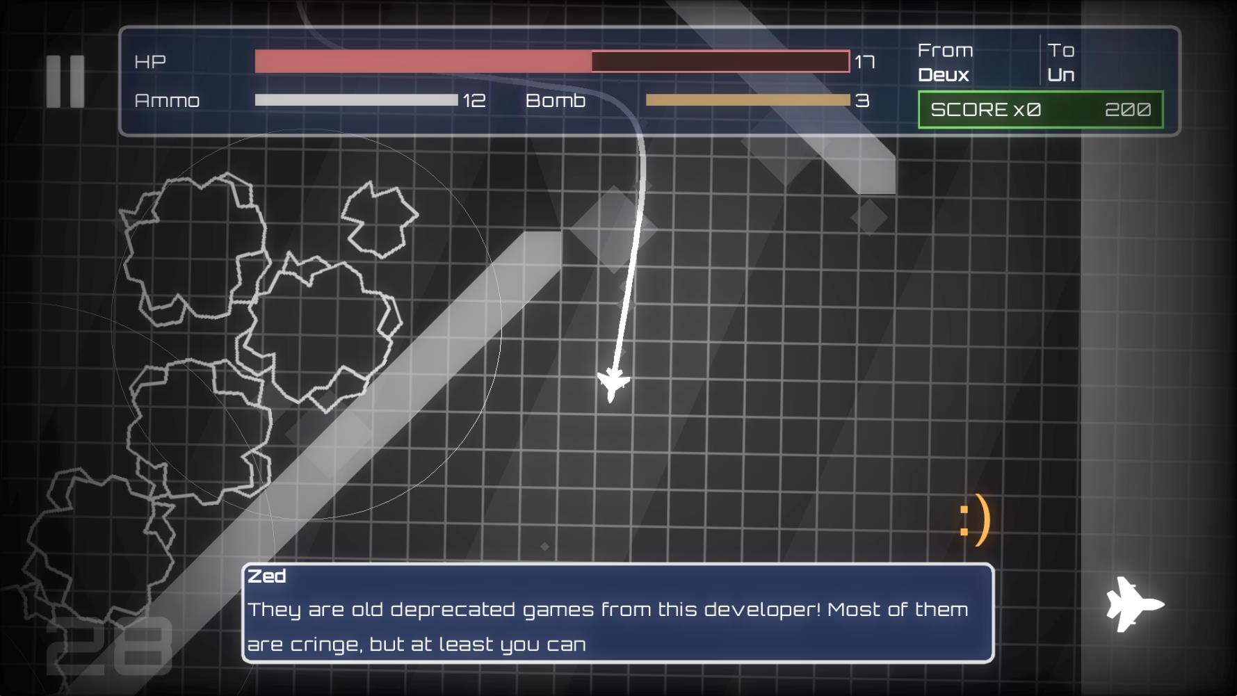 4、正式开始后点击左右屏幕可以控制飞行的方向,同时按住两边的屏幕可以发射子弹摧毁敌人和障碍物。屏幕上方的HP是血量,Ammo是弹药,Bomb是炸弹数量