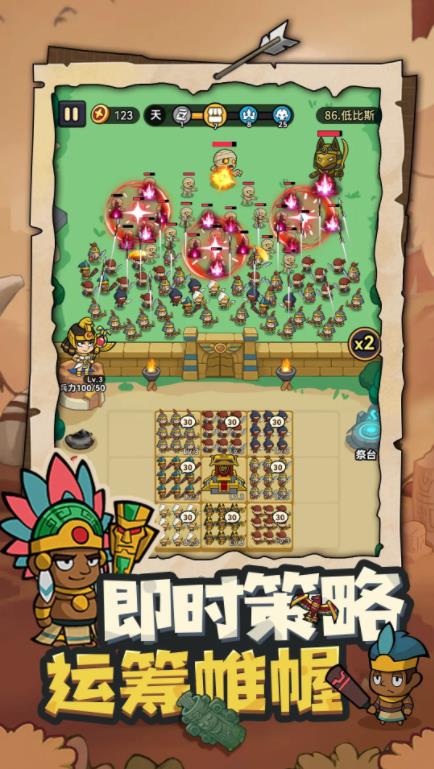 我有一计是一款挂机策略游戏。玩家并非传统塔防中直接建造防御塔,而是作为文明的决策者,在每一波开始前,从所选文明的特色军备库中挑选单位并规划其站位,随后观看自动演算的战斗过程。我有一计游戏核心在于战前的资源分配博弈与兵种连锁反应设计,考验的是预判与构建能力,而非实时操作。