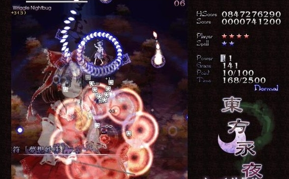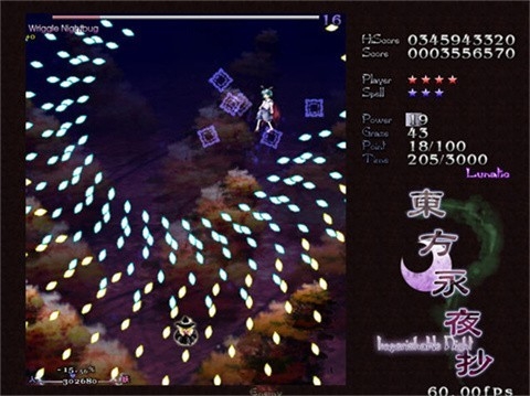 4、然后就进入游戏了,Z是发射子弹,X是BOMB,还有SHIFT键(按住),是切换人物,按住SHIFT键后一般移动速度都会慢一些,另外就是在你的机体中心出现一个白点,此点为判定点,此点不被命中时,你不会有事。
