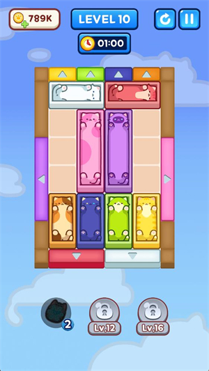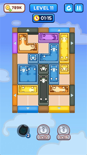 3、当方块移动到对应颜色的区域后猫咪就可以离开,当所有方块里的猫猫全部逃脱后就可以通关。