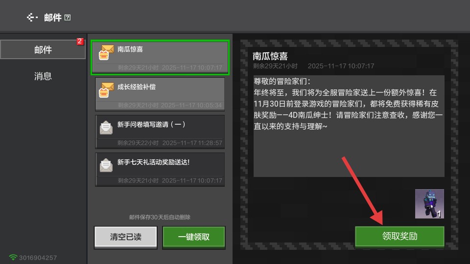 3、点击邮件点击领取奖励。