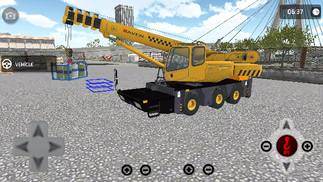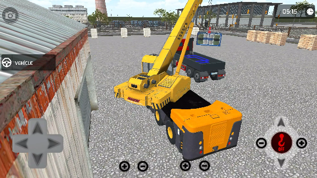 1.启动起重机,使用左侧虚拟方向键控制车辆移动,同时通过右侧的按钮调整吊臂的升降和旋转,将蓝色集装箱从仓库门口吊起。