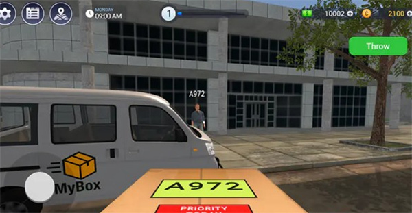 2.搬运完成后,玩家驾驶印有“MyBox”标志的货车前往下一个配送点。画面中显示目标包裹编号为“A972”,前方有一名客户等待取件。车辆停靠在目的地附近,准备交付包裹。