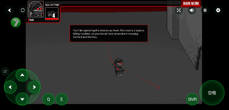 2.游戏开始后,玩家将操控角色Hank执行任务。Hank是一名强大的战斗专家,任务目标是解救Sanford和Deimos。界面左上角显示角色头像、武器和子弹数量。