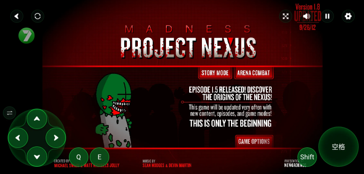 1.进入游戏主界面,选择“STORY MODE”或“Arena Combat”模式开始游戏。当前版本为1.8,并提示新内容将持续推出。