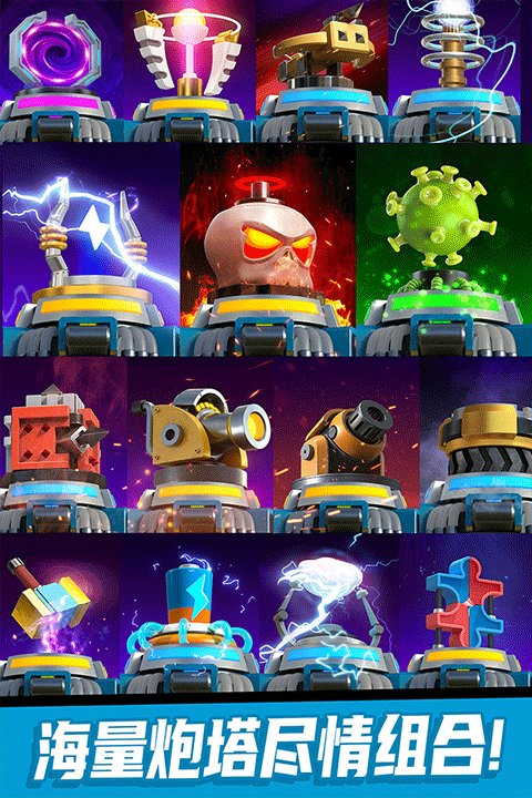 2.提供多种炮塔与角色,炮塔可通过合成升级,并拥有不同攻击属性与技能,搭配策略丰富