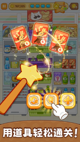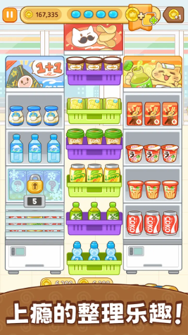 整理闯关:关卡目标是整理杂乱货架。你需要将货品从一个箱子拖到另一个箱子,完成三个相同物品的匹配消除。关卡通常有时间限制,剩余时间越多,奖励越丰厚。
