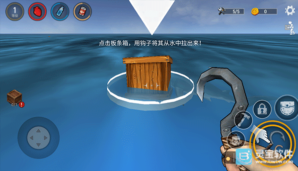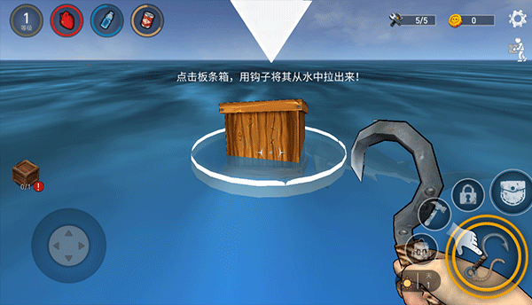 4、转动左侧的操纵杆,瞄准好木箱的位置,点击右侧的钩子就能够将东西从水中拖过来。