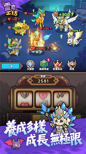 游戏采用了经典的放置玩法。离线期间,你的灵宠小队会持续进行关卡挑战并积累资源。再次上线时,你可以轻松收获大量金币、经验与材料,用于升级工坊、强化灵宠。这种设计完美适配碎片化时间,无需高强度操作也能稳定成长,告别传统游戏“爆肝”的压力。