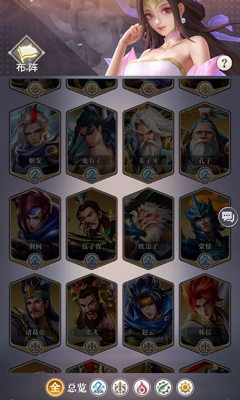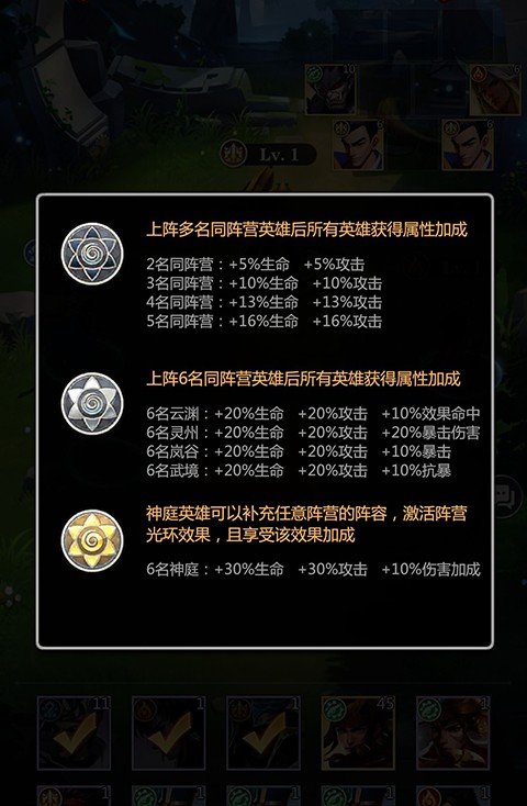 1、游戏内有着云渊、武境,灵州,岚谷,神庭五大阵营英雄,还分为攻、突、防、辅四种职业类型