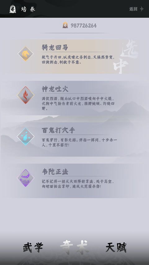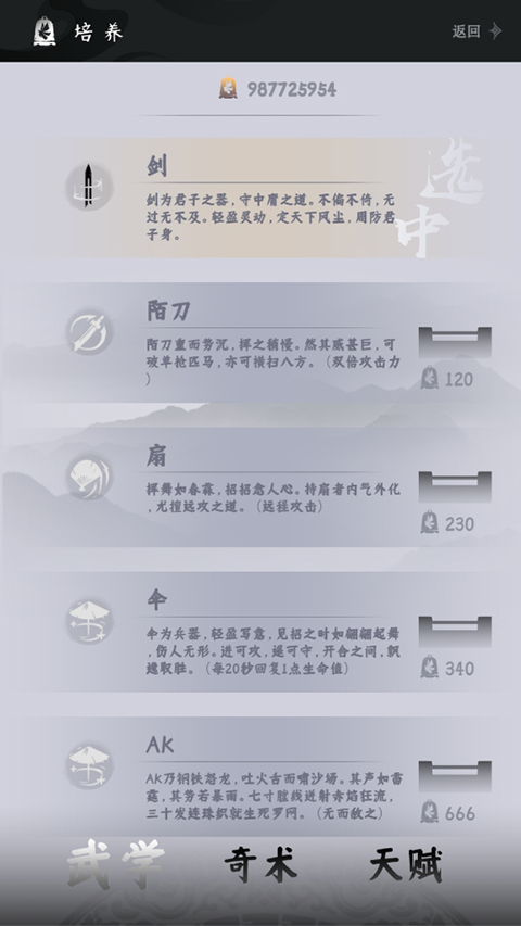 3、这里可以解锁武学,不同的武学拥有不同的攻击效果。