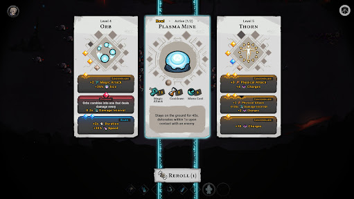 深度的背包内合成与构筑:游戏的核心创新在于背包内的装备改造系统。你可以将获取的元素装备(如提供伤害加成的“Orb”或提供防御的“Thorn”)像卡牌一样在背包中组合、替换。利用“重roll”机制刷新其附属属性(如+Pyro火系伤害、-25% Sulfur消耗),主动构筑出符合当前战局需求的装备套装。