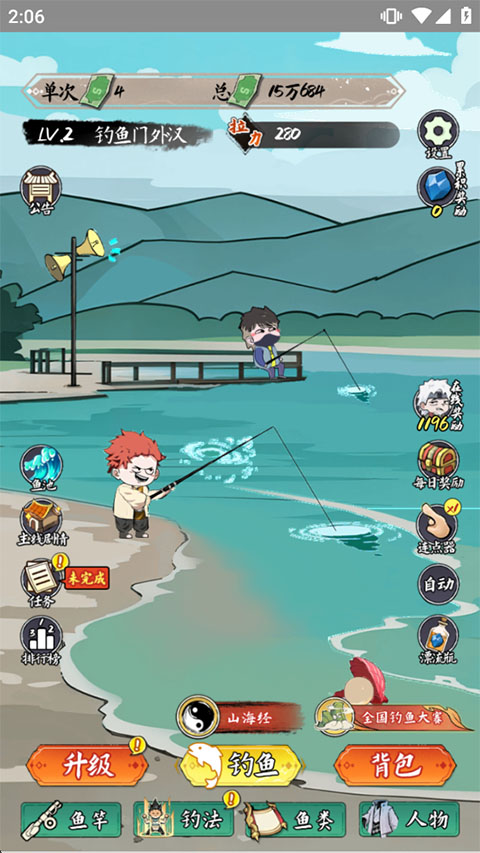 丰富的角色、鱼竿与收集图鉴:你可以解锁并培养多位钓鱼佬(如“红毛哥”),每位都自带独特的初始钓法。同时,鱼竿、钓法、鱼类(包括普通鱼和山海经风格的变异怪)均拥有独立的升级线和收集图鉴,满足玩家的收集与养成欲望,驱动长期游玩。