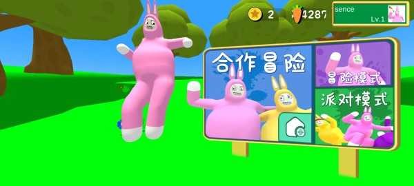 1、打开超级兔子人双人版,游戏内先有子合作冒险、冒险模式、派对模式三种模式,这里以模式模式为例;