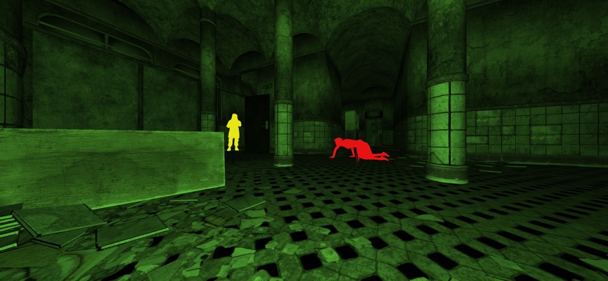 游戏结构:游戏地图分为两层,整体为“8”字行构造,出生点为一楼8字行中间,玩家需要在一楼找到绿色的卡才可以通往2楼。