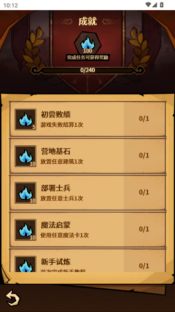 4.点击“成就”按钮,进入成就界面,显示玩家完成的各种任务进度,例如“初尝败绩”、“营地基石”、“部署士兵”等,完成任务可获得奖励。