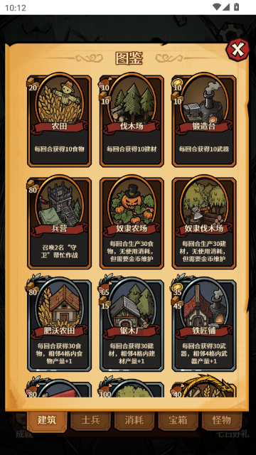 2.点击“图鉴”按钮,进入图鉴界面,这里展示了游戏中各种建筑卡牌,如农田、伐木场、锻造台等,每张卡牌下方标注了其功能和建造所需资源。