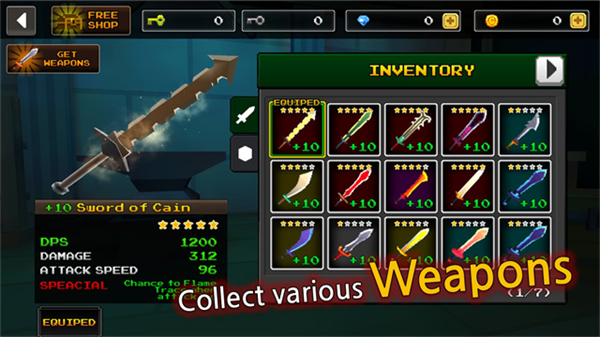 像素刀片中文版是一款一款像素风格动作RPG手游。玩家扮演像素世界上最后的英雄,通过关卡制推图深入地下城,狩猎怪物,收集武器,最终目标是拯救世界。像素刀片中文版游戏采用虚拟摇杆+按键操作,左侧移动、右侧攻击与技能释放,支持自动战斗。像素刀片中文版画面为2D像素风格,主界面音乐厚重,战斗音效绚烂,地图模型有一定细节,但人物与怪物模型较为简单。