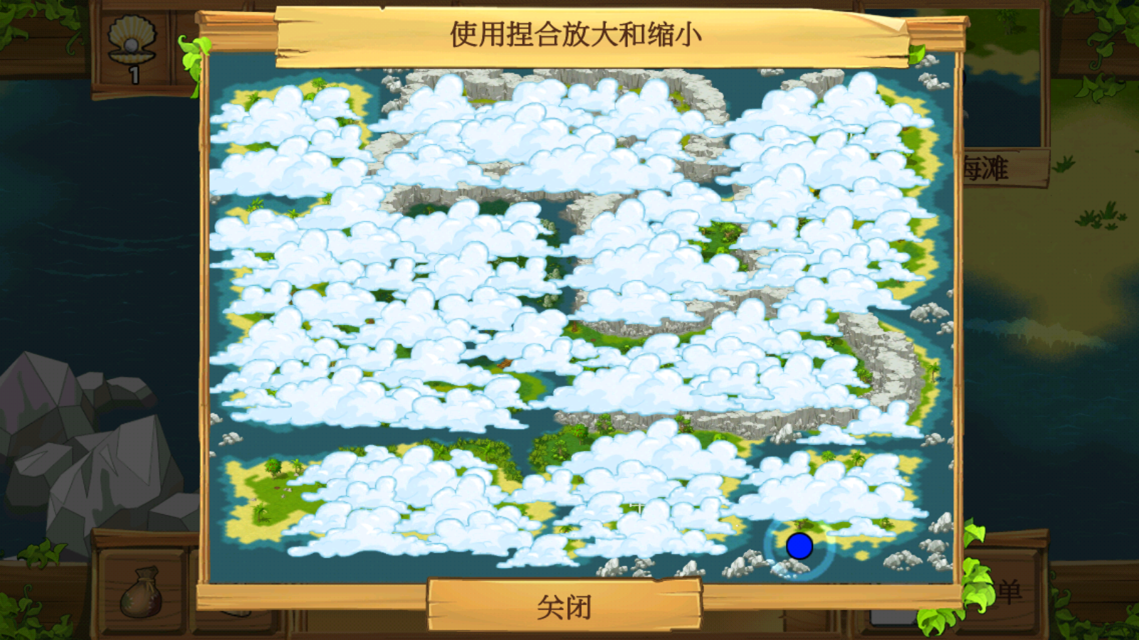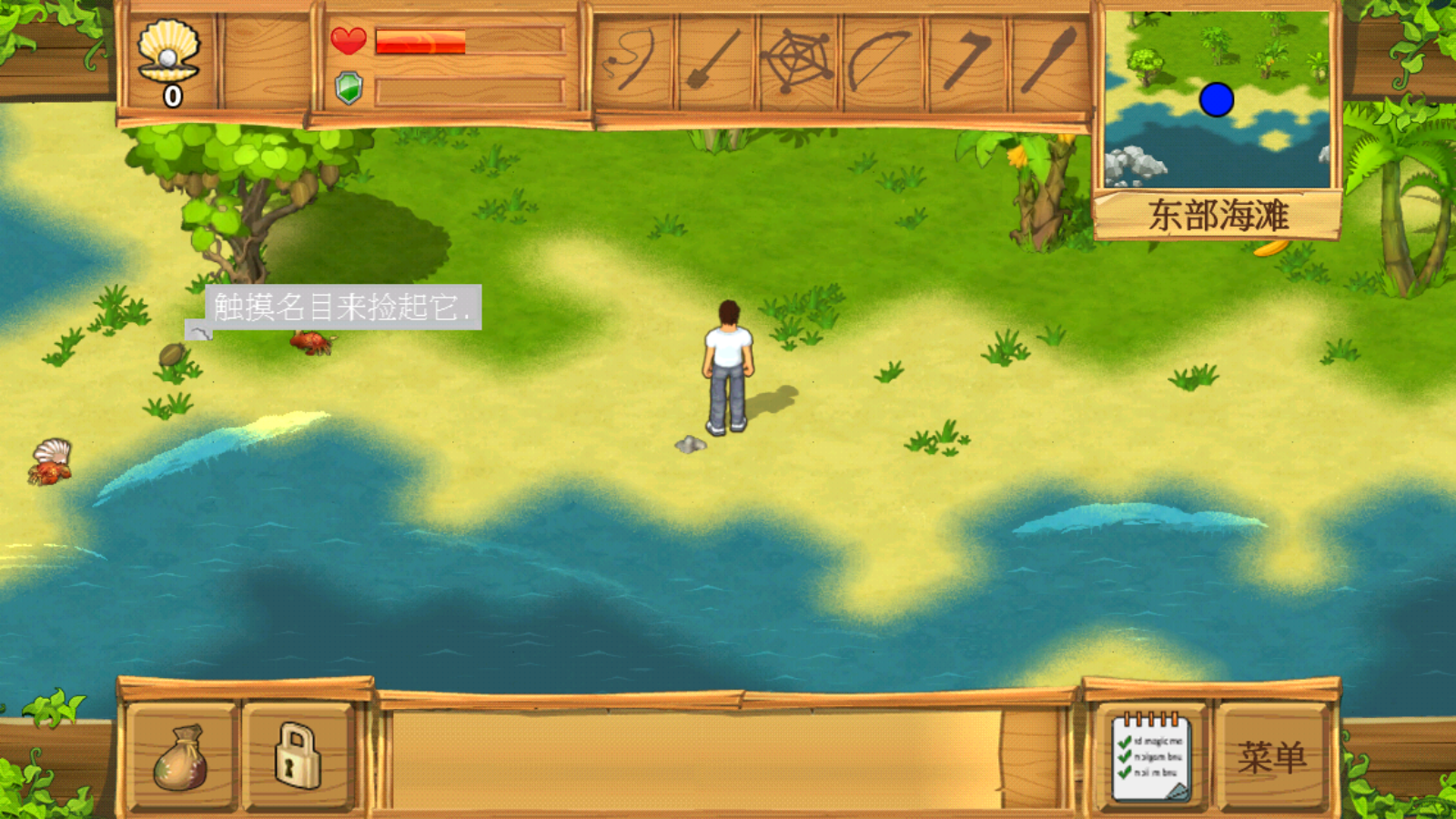 1、滑动屏幕就能控制角色移动,记得探索海滩,能够收集一些贝壳,木材等,当然也能进入森林收集水果。