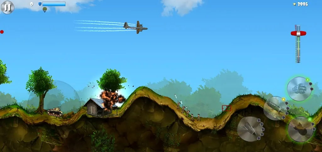 2、游戏中操控飞机在地形上方飞行,利用重力和弹道控制投弹时机,摧毁地面坦克与士兵,注意避开障碍物和敌方火力点。