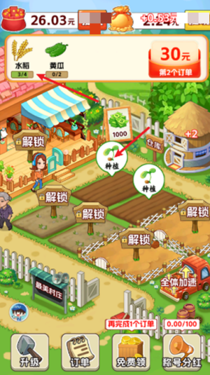 4、将收获的作物运送到仓库,点击“订单”按钮提交,完成订单后获得现金奖励和经验提升。