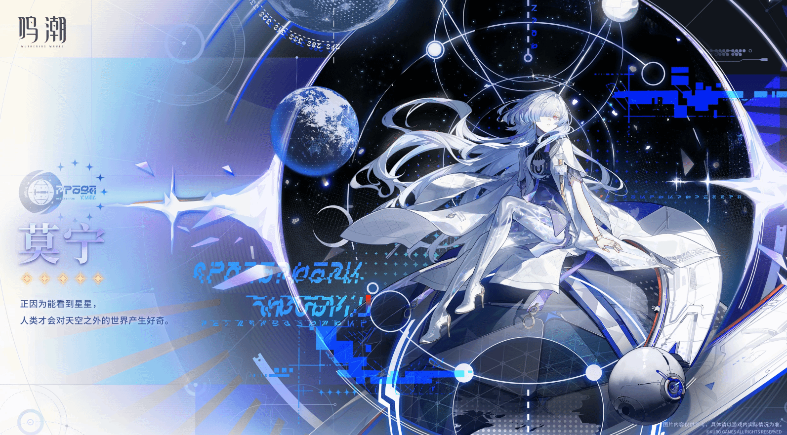 莫宁是深空联合研究院学者、星炬学院教授,思维敏捷却不善言辞。她对于自己想要达成的目标有着惊人的坚持——期望跨越那时空的鸿沟,以双手触碰世界的宏大与美丽。