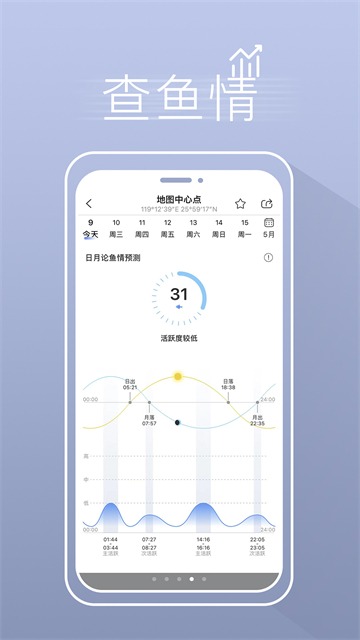 以潮汐为核心的多维环境决策系统: 提供精准的潮汐曲线、日出日落、月相及水流变化数据,并结合实时气压、气温、风力预报,生成专属的钓鱼指数预报,辅助判断最佳作钓时机,告别盲目出行。